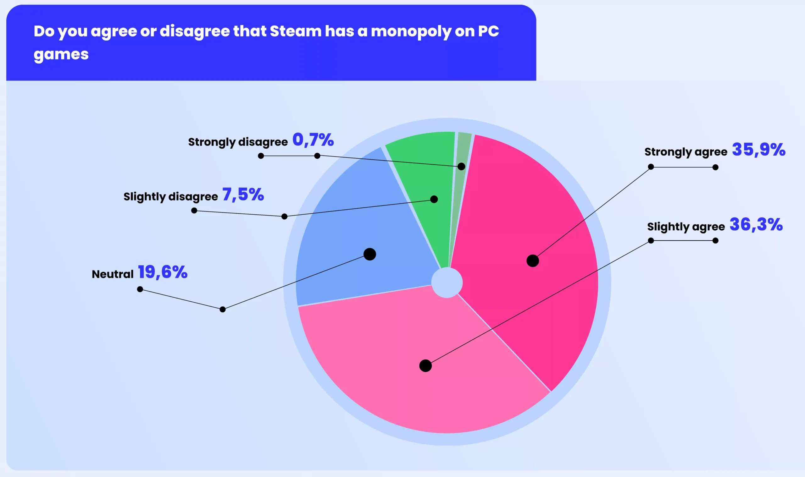 In a survey of over 300 executives from large US and UK game companies, 72% either slightly or strongly agreed that Steam constitutes a monopoly over PC games. Furthermore, 88% said that at least three-quarters of their revenue came from Steam, while 37% reported that the platform accounted for 90% of their total revenue.