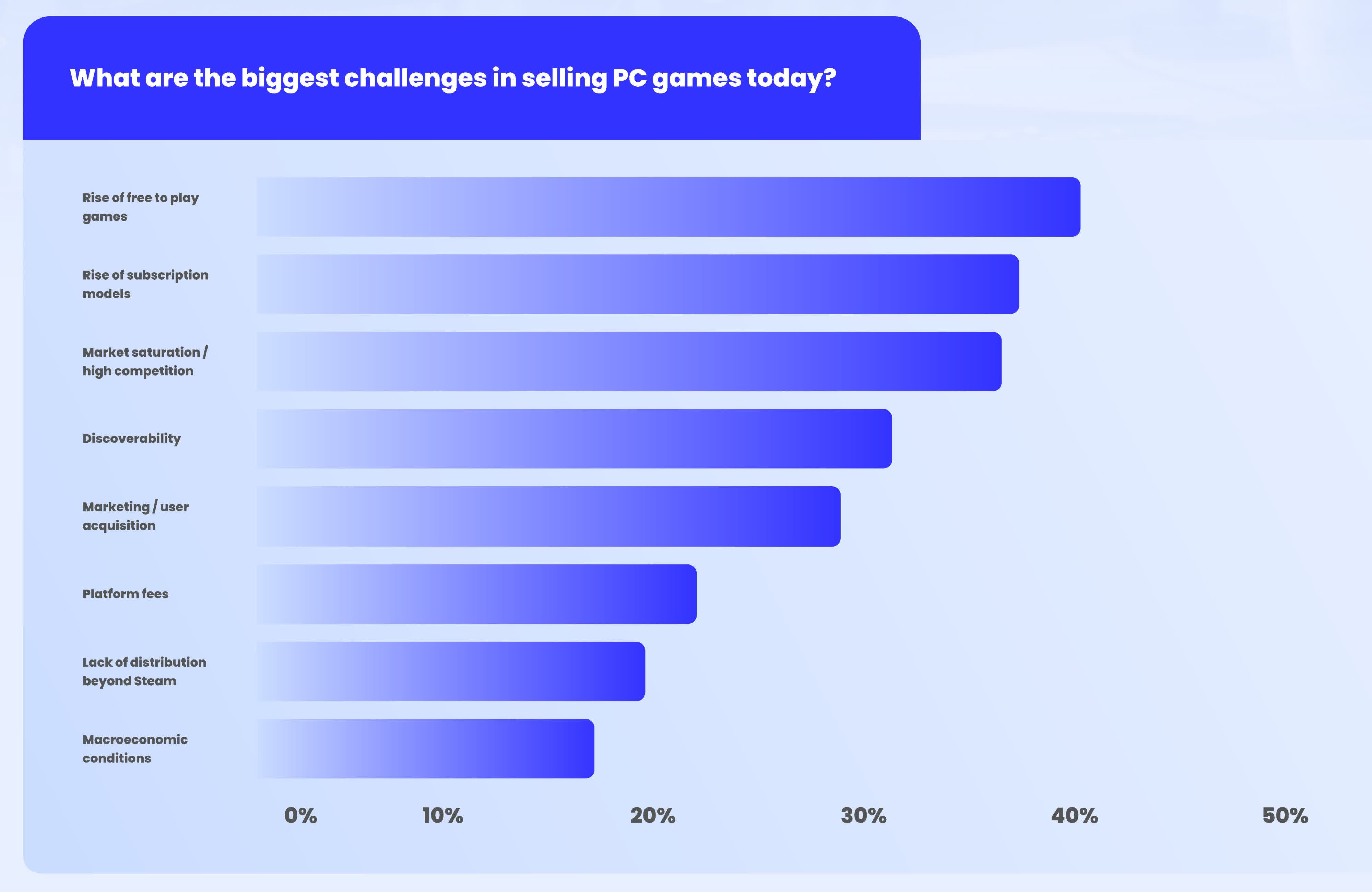 The increasing popularity of free-to-play games such as Fortnite, DOTA 2, Counter-Strike 2, Call of Duty: Warzone, and Roblox topped the list of concerns for 40% of respondents. Approximately a third mentioned market saturation and discoverability, echoing data that suggests there aren’t enough players for the thousands of new titles released on Steam each year. A similar portion of survey respondents also expressed concerns regarding subscription services.