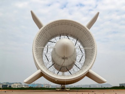 The name might be a bit ambitious, since its 2000 m test flight is only one tenth of the way to the stratosphere, but Yibin isn’t a bad choice for testing: as it is well inland, the S2000 prototype won’t have to contend with typhoons or other ocean storms. The prototype is arguably as ambitious as the name: its 12 flying turbines have a peak capacity of three megawatts. True, there are larger turbines in wind farms right now, but at 60 m in length and 40 m in diameter, the S2000 has a lot of room to grow before hitting any kind of limit or even record for aerostats. We’re particularly interested in the double-hull construction– it would seem the ring of the outer gas bag would do a good job funneling and accelerating air into those turbines, but we’d love to see some wind tunnel testing or even CFD renderings of what’s going on in there.